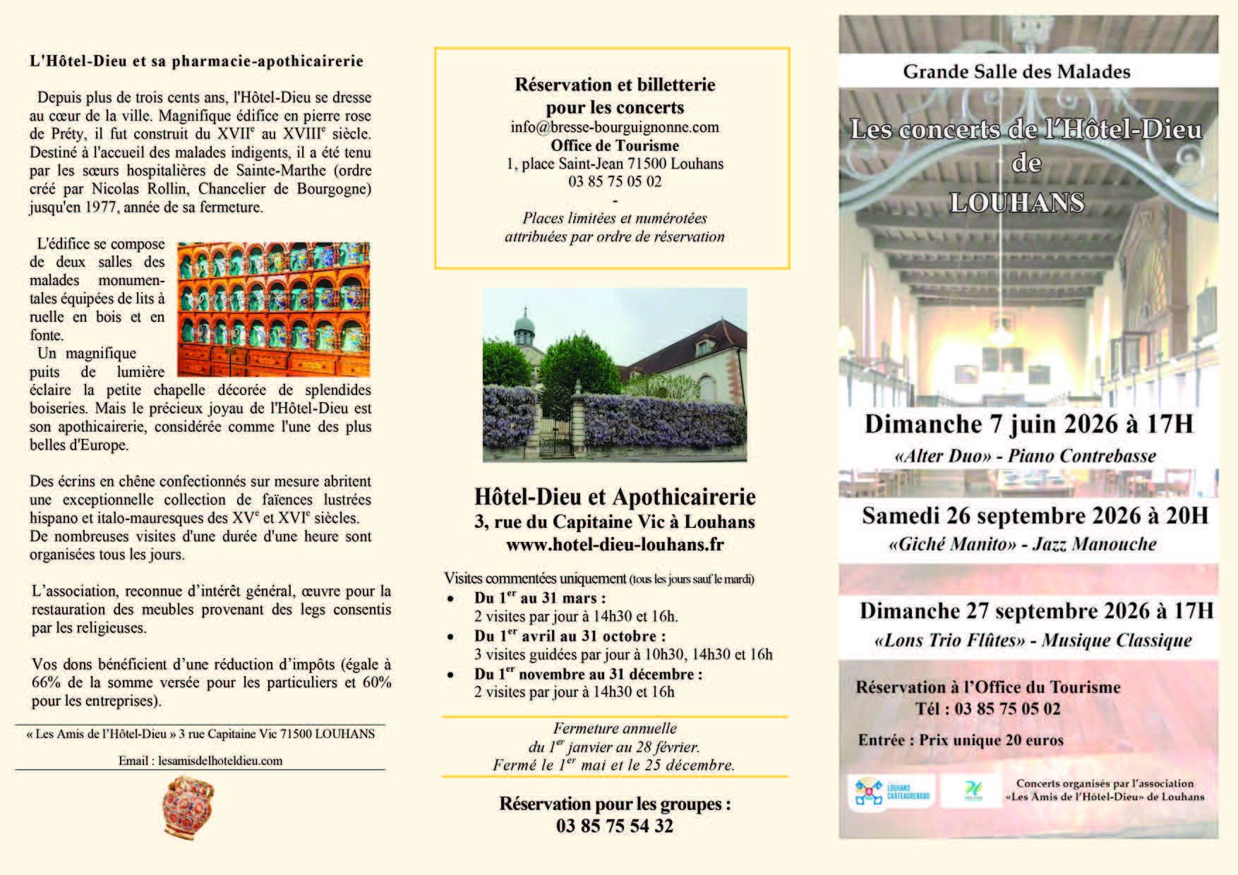 Louhans s’honore aussi de posséder l’un des plus beaux Hôtels-Dieu de France, ensemble architectural d’une grande pureté, non remanié depuis sa reconstruction dans la seconde moitié du XVIIIè siècle. Il abrite une apothicairerie unique, dotée d’une collection prestigieuse de pots, chevrettes, et albarelli en faïence hispano et italo-mauresques des XVè et XVIè siècles.